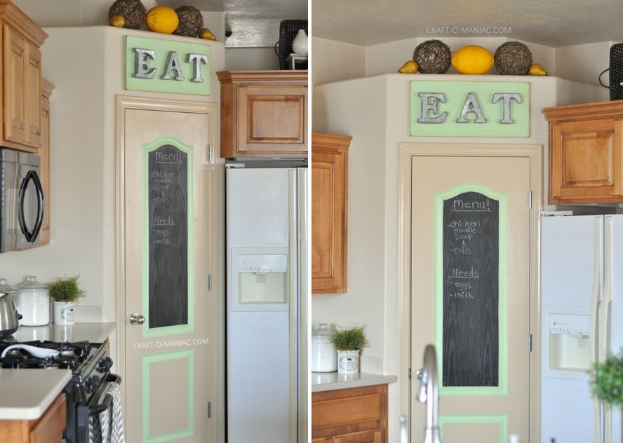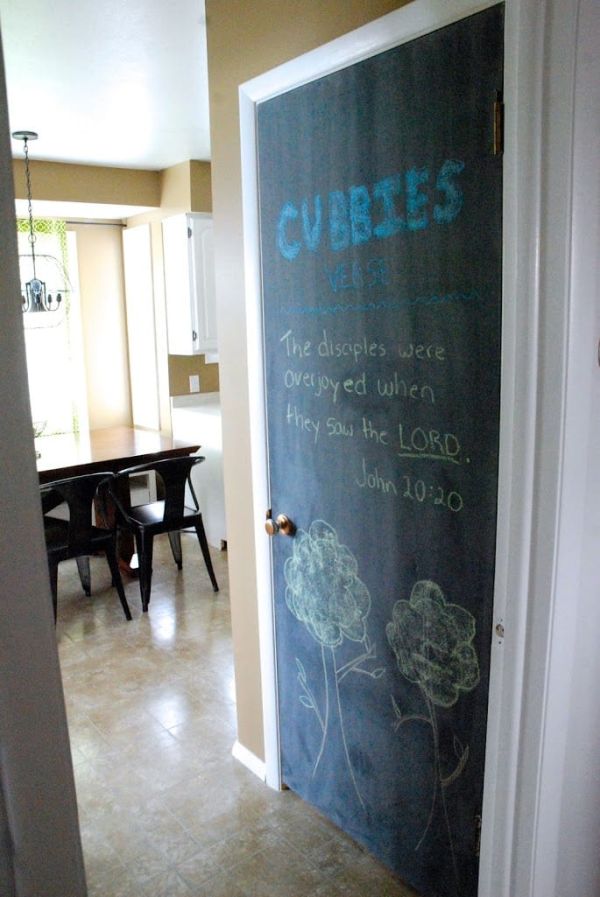Otra forma genial de hacer que la despensa de la cocina se destaque es decorar la puerta de una manera llamativa y práctica. Una muy buena idea es pintar una pizarra en él. De esa manera, puede escribir el menú en la puerta, escribir notas, recetas, listas de compras o simplemente dibujar algo lindo o inspirador. En craft-o-maniac puedes encontrar detalles sobre cómo personalizar una puerta de este tipo.