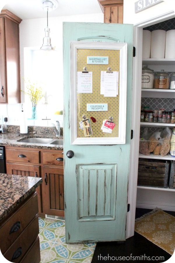 Por lo general, no hay mucho espacio libre en una cocina, por lo que es práctico aprovechar cualquier cosa que pueda ser multifuncional. La puerta de la despensa es una de esas cosas. Una idea particularmente buena cuando se trata de eso es colgar un tablero organizativo o un tablero de notas en la puerta de la despensa. Este puede ser un lugar donde guarde sus recetas favoritas, haga listas de compras, etc. Echa un vistazo a thehouseofsmiths para ver cómo se hace.