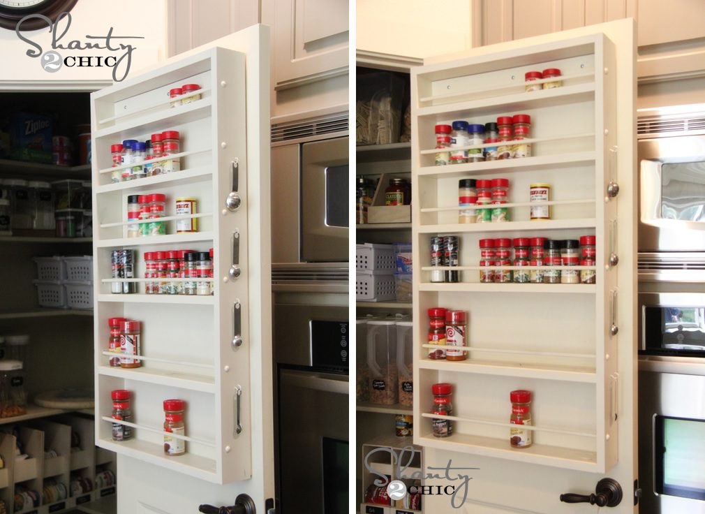 Tan práctico como es el espacio dentro de la despensa de la cocina, siempre es bueno maximizarlo aún más y una excelente manera de hacerlo es colocando estantes en el interior de la puerta de la despensa. Puede construir una unidad pequeña con varios estantes poco profundos lo suficientemente profundos para contener sus especias. No pesaría mucho y te permitiría organizar tus especias de una manera muy agradable y sin preocuparte de que estés desperdiciando espacio. Echa un vistazo a los detalles de este proyecto en shanty-2-chic .
