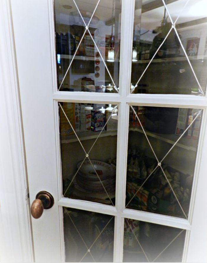 Si la puerta de su despensa tiene paneles de vidrio, esto le daría la oportunidad de agregar algunas decoraciones como cristales y cinta adhesiva. No es exactamente una práctica común, por lo que primero debe consultar esta publicación de redheadcandecorate para ver de qué se trata. Es bastante simple en realidad. Simplemente usa las pegatinas para hacer un patrón simple en forma de X en cada panel de vidrio y agrega un cristal en el centro de cada uno.