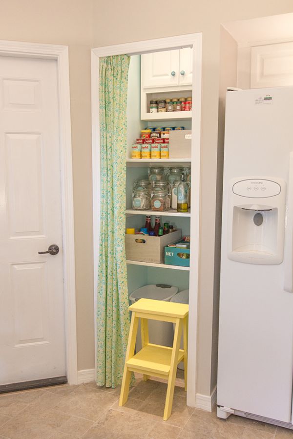 A veces es más práctico colgar una cortina que poner una puerta. Esto tiene sentido para una despensa en la cocina, especialmente cuando tiene poco espacio y un regular solo se interpondría en el camino o una puerta corrediza no encajaría. Las cortinas también son más baratas y puedes hacerlas y colgarlas tú mismo. Puede encontrar todos los detalles en jennasuedesign si está interesado.