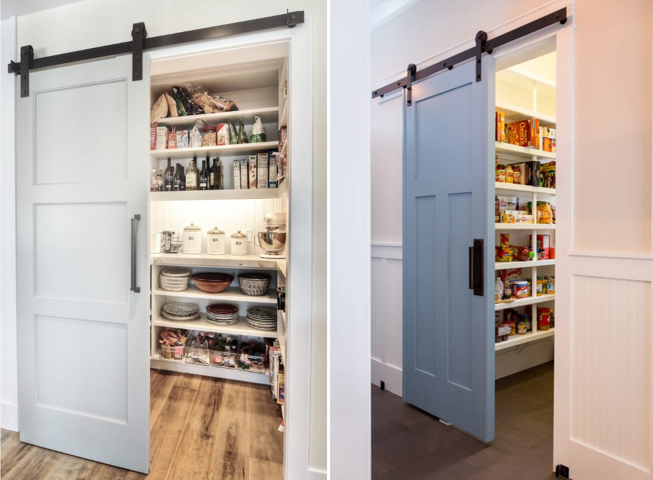 Si encuentra que las puertas corredizas de granero son prácticas y particularmente adecuadas para su despensa, pero realmente no quiere que se conviertan en el centro de atención, una opción es pintarlas para que se mezclen más fácilmente. Puede pintarlos en un color similar al de las paredes adyacentes para tal efecto. Foto de Sunburst Shutters & Window Fashions Charlotte