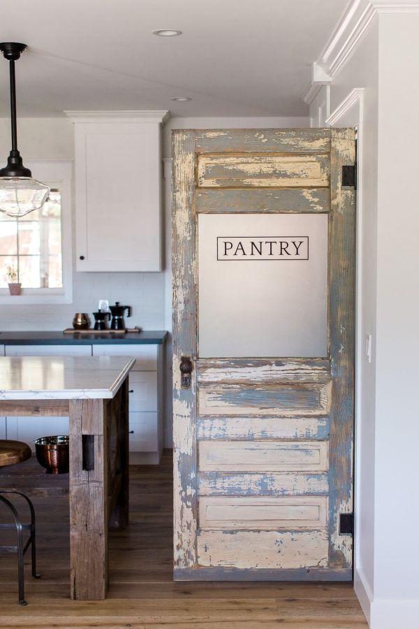 Otra idea realmente genial es usar una puerta vieja recuperada para la despensa. Puede limpiar un poco y hacer algunas reparaciones si es necesario, pero principalmente intente conservar su aspecto original y especialmente la estética desgastada. Esto es lo que le da carácter y lo hace auténtico. Echa un vistazo a rafterhouse para ver cómo se vería algo como esto.