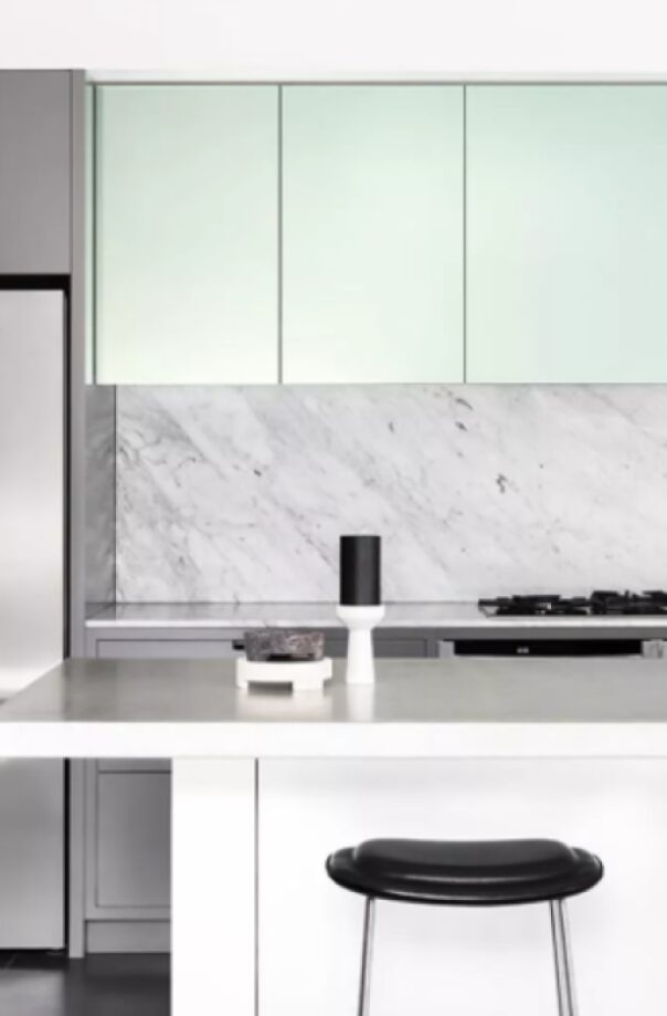 Si bien esta cocina de Sharyn Cairns Design: Fiona Lynch sigue principalmente un diseño minimalista con un esquema de color gris y blanco, nos encanta la adición de pasteles. Si bien los gabinetes verdes todavía son bastante apagados, agrega un toque de color y una declaración audaz cuando se combina con los otros colores en la cocina. Sus ojos son atraídos instantáneamente hacia arriba para ver el color verde de los gabinetes, lo que asegura que la habitación aún parezca luminosa y moderna. Esto funcionaría con cualquier color pastel, pero creemos que el verde y el azul son opciones perfectas para combinar con una cocina gris.