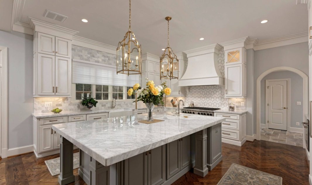 Creo que todos pueden estar de acuerdo en que el mármol se ve increíble en cualquier cocina. El mármol blanco en particular tiene un ambiente muy elegante y moderno. Puedes verlo aquí combinado con una serie de gabinetes de color gris claro y un piso de madera. Añade un toque refinado y elegante al diseño y da vida a la decoración sin ser muy atrevido.