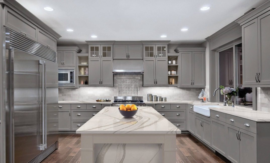 4. Gabinetes de color gris claro y una isla a juego