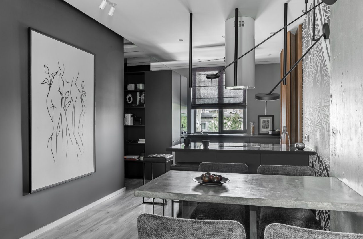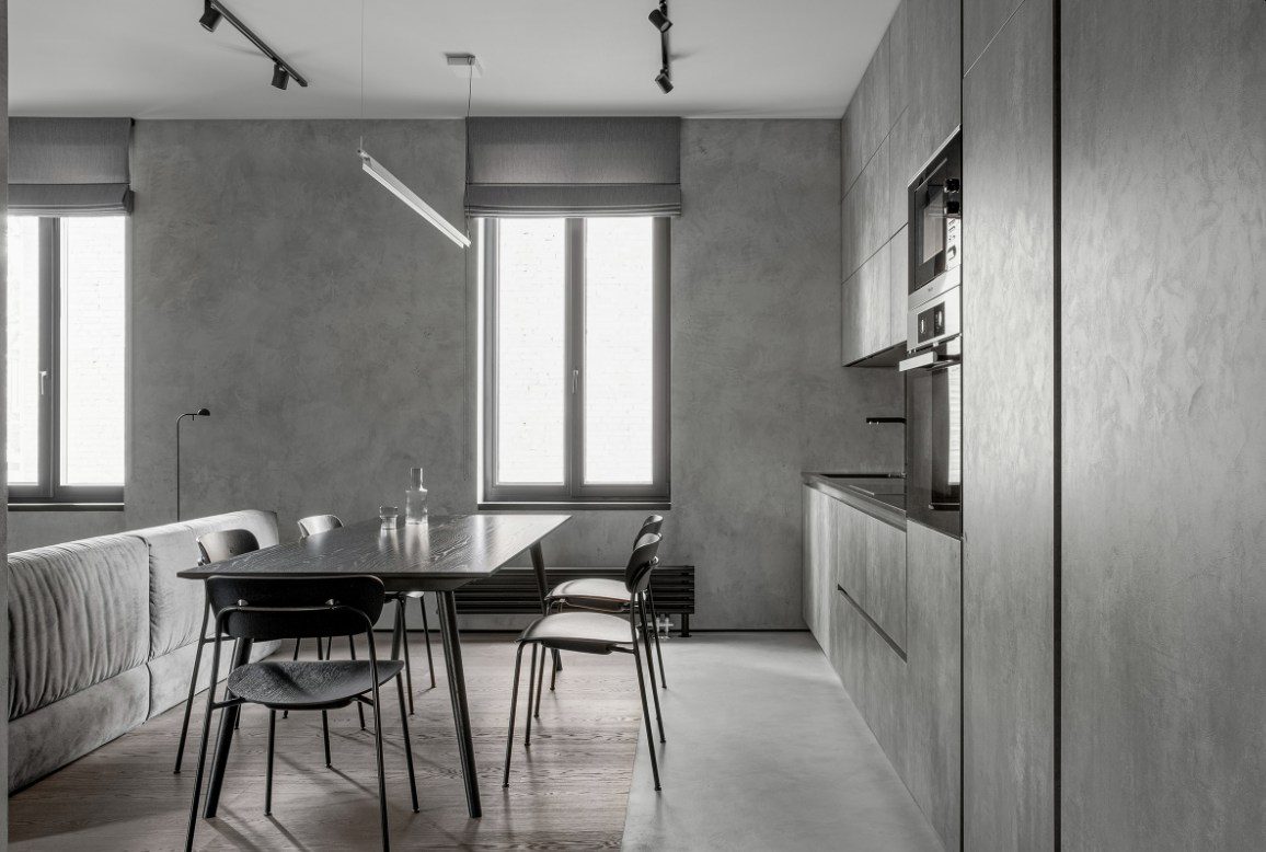 Otro interior igualmente simple y elegante fue diseñado por Olga Paliychuk . El enfoque aquí estaba en los grises claros y la forma en que interactúan con los acabados texturizados y otros matices similares. Esta cocina tiene un ambiente aireado pero también es acogedora. Los gabinetes grises combinan perfectamente con las paredes de la habitación, lo que les permite combinarse perfectamente y hacer que el espacio parezca más grande.