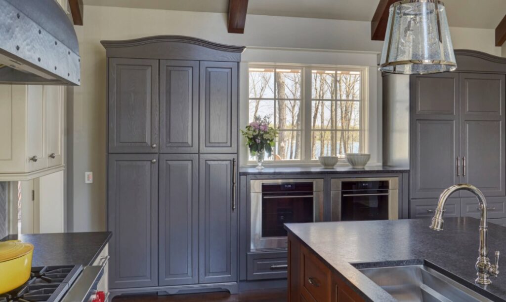 En caso de que te lo estés preguntando, los grises más oscuros también pueden lucir hermosos en la cocina. El diseño general tradicional del espacio se siente fresco y elegante gracias a esta paleta de colores tenue y bastante moderna. Por supuesto, elementos como la isla y el piso de madera, las vigas expuestas del techo y algunos de los electrodomésticos y accesorios ayudan a conectar el espacio y resaltar el estilo de una manera sutil pero efectiva. Este es un interior realizado por Orren Pickell Building Group .
