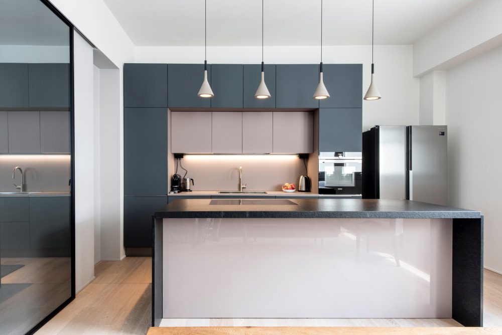 La simplicidad es la clave para crear un diseño interior contemporáneo. La cocina creada por ORKO Studio es la definición misma de eso. Nos encanta lo pura y simple que se mantuvo aquí la paleta de colores y materiales. Lo que más se destaca es, irónicamente, la serie de gabinetes grises que carecen de herrajes o detalles visibles.
