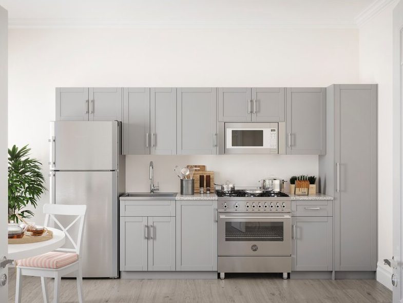Una de las mejores cosas de los gabinetes grises es que el color funciona con cualquier material de gabinete. Estos gabinetes grises modernos y brillantes compartidos por Oppein se verán geniales en cualquier apartamento u hogar contemporáneo. Descubrirá que a pesar de que usan un tono de gris ligeramente más oscuro, no se ven demasiado oscuros o sombríos debido al material brillante del que están hechos. Puede mezclar y combinar diferentes tamaños de gabinetes para crear su configuración de cocina perfecta. Estos gabinetes más pequeños caben alrededor del área del fregadero, por lo que no tendrás que preocuparte de que caigan demasiado y te golpees la cabeza.