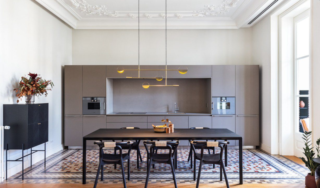 En muchas casas modernas y contemporáneas, la cocina y el comedor a menudo se combinan en un solo espacio grande. Eso también se puede ver en este ecléctico apartamento amueblado por Coblonal Interiorisme . Toda la cocina se empuja contra una sola pared y tiene un ambiente inspirado en la sala de estar con un aspecto limpio y simple. Los gabinetes cuentan con un agradable tono de gris cálido que combina muy bien con el intrincado diseño del piso.