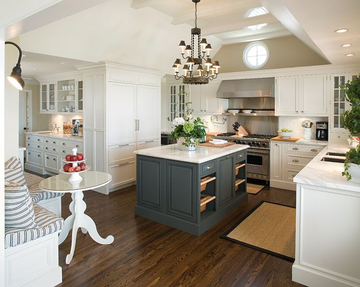 Hay muchas maneras diferentes de introducir los grises en la cocina. En este escenario, tenemos una cocina tradicional que tiene una paleta bastante diversa de materiales y acabados utilizados en su diseño. El color de las paredes es solo ligeramente diferente al de los gabinetes y el protector contra salpicaduras hace un gran trabajo al combinar los matices. La isla tiene un cuerpo gris oscuro que le permite destacar. Este es un diseño del estudio Great Falls Construction .