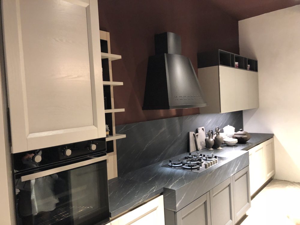 El elegante diseño presenta superficies de color gris oscuro en la parte superior que se vuelven más claras hacia la parte inferior gracias a los gabinetes más claros.