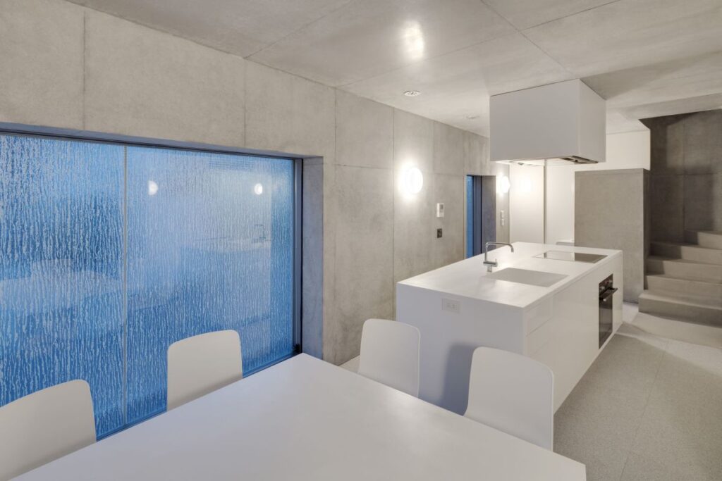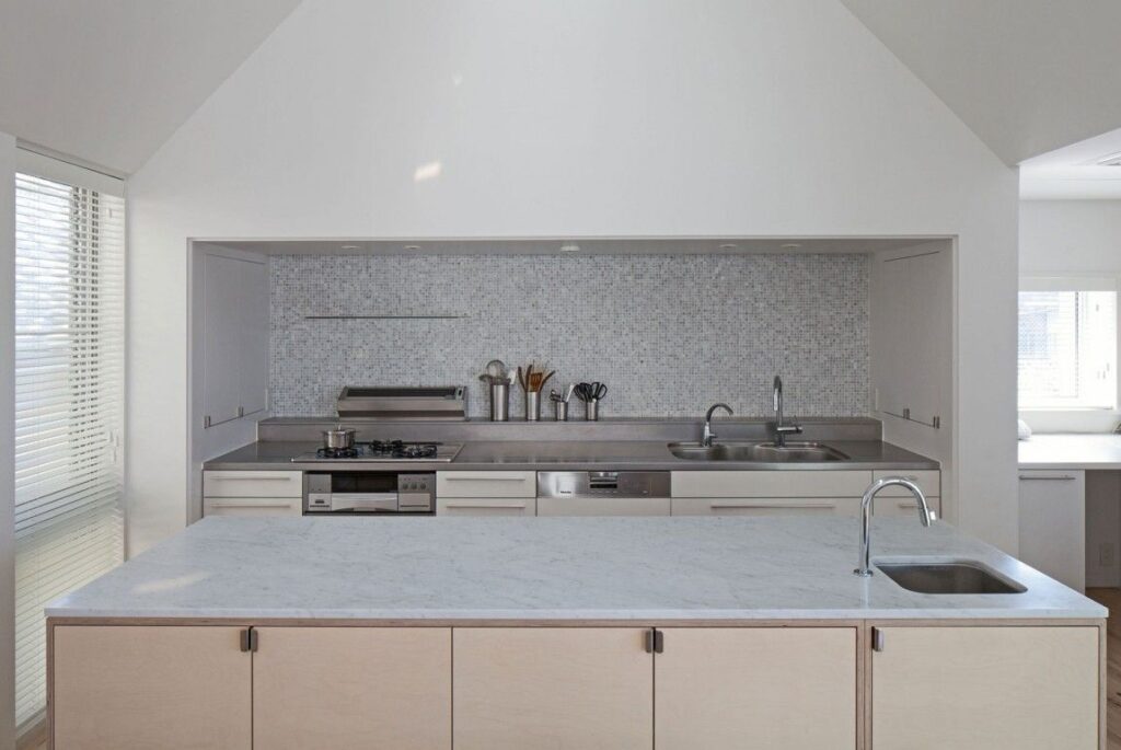 Diseñada para parecer simple y escultural, esta cocina es parte de una casa que comparte las mismas características que la definen. Asentada en un terreno dos metros por debajo del borde de la carretera, la casa y la cocina en particular ofrecen maravillosas vistas.