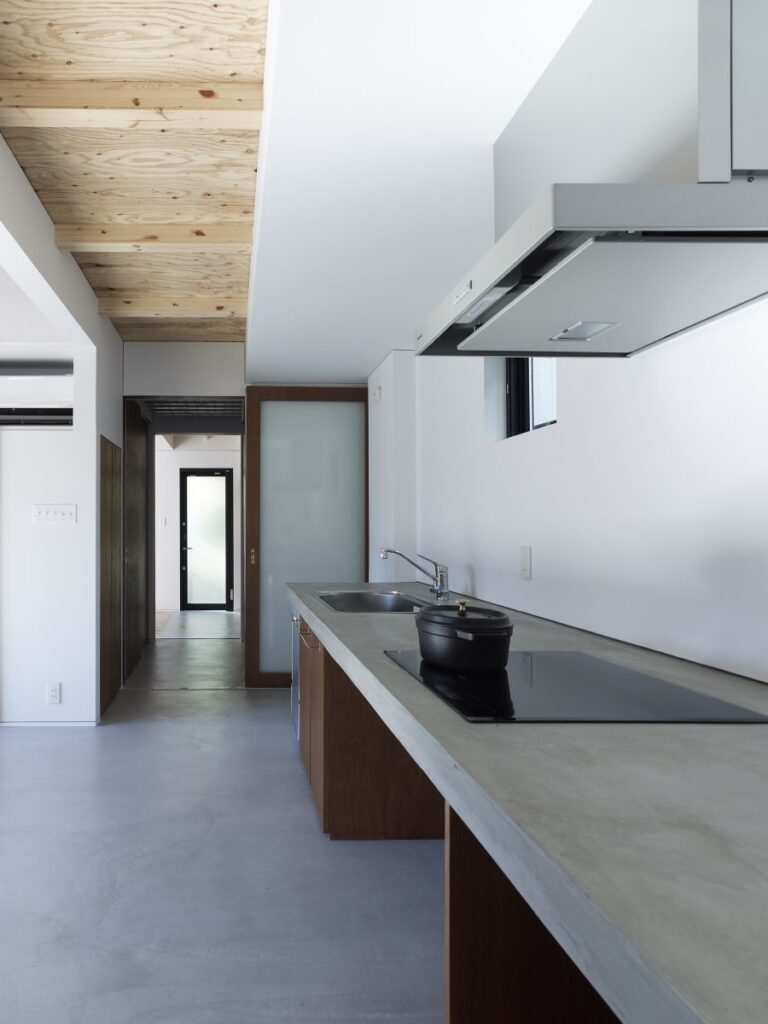 Utilice materias primas y acabados como el hormigón para darle a su cocina de inspiración japonesa un toque industrial contemporáneo. Todavía puedes hacer que la habitación se sienta acogedora a través de otros elementos.