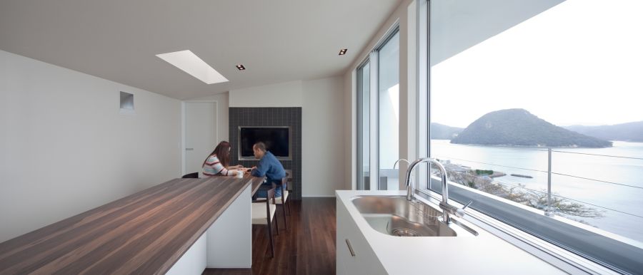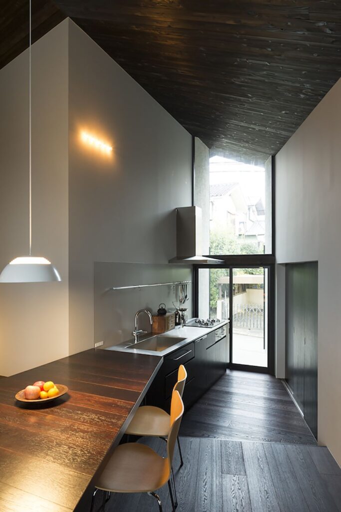 Dale más carácter a tu cocina minimalista con elementos como un accesorio de iluminación simple pero interesante, un toque de verde o un diseño que sepa aprovechar las vistas y los espacios adyacentes. {Encontrado en arakawaarch }.