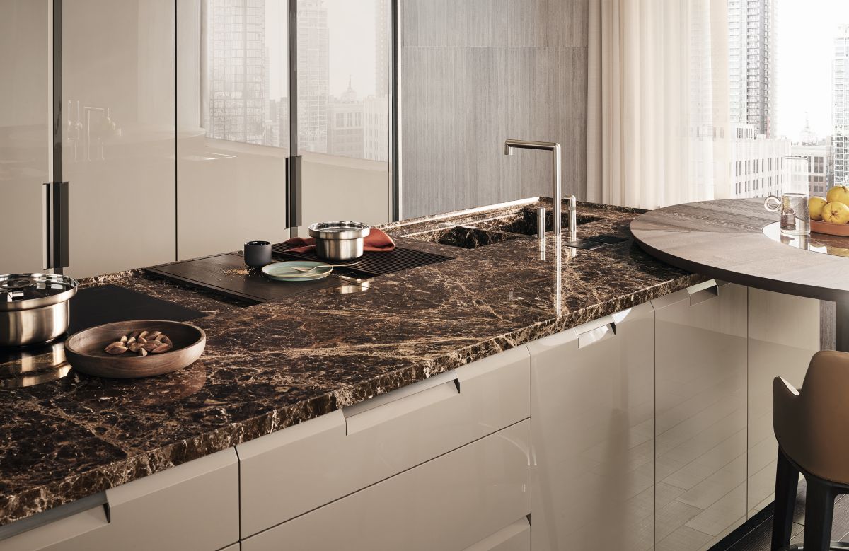 La cocina Shape de Poliform presenta una combinación de madera, acero y mármol y una estética claramente minimalista y contemporánea. El detalle más destacable que define a esta serie es la ausencia de tiradores tradicionales. En cambio, tiene este corte cónico único con un asa incorporada en su interior.