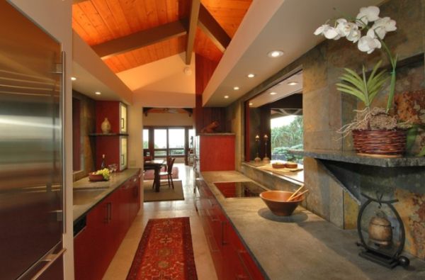 Esta es una cocina con una decoración tropical muy bonita. Los colores son vibrantes pero no perturbadores y la paleta de colores no es tan diversa. Pero el espacio parece muy cálido y acogedor y eso se debe a los tonos de rojo utilizados para la alfombra y los muebles y al hecho de que el techo con paneles de madera parece reflejarse en el suelo, los muebles y los electrodomésticos.