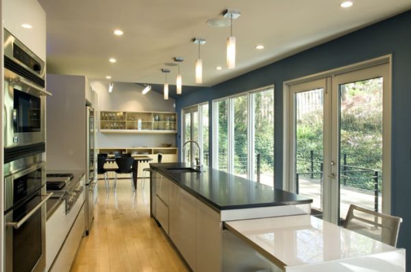 Esta cocina contemporánea también es larga y estrecha. Pero como esta sala es bastante grande, también se creó un comedor en un extremo. Se colocó una larga isla de cocina cerca de las grandes ventanas. También tiene una pequeña extensión de mesa para que pueda usarse como superficie de trabajo, barra o espacio para desayunar. La ventaja en este caso es que la cocina tiene una terraza adyacente, por lo que no parece tan estrecha después de todo.