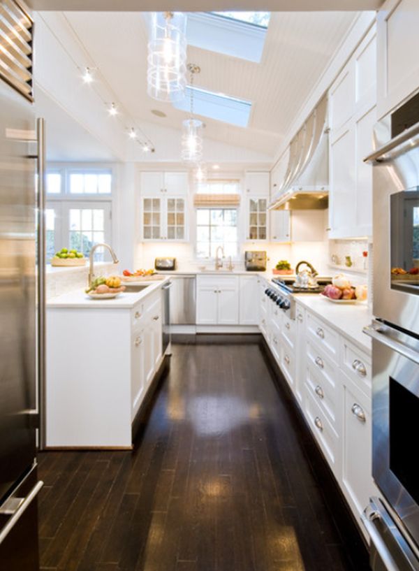 Nuestro siguiente ejemplo es una cocina muy luminosa con un interiorismo ecléctico . También es largo y estrecho, pero el hecho de que el techo y las paredes hayan sido pintados de un blanco intenso hace que parezca más aireado y espacioso. Los tragaluces también son un detalle muy bonito y dejan pasar mucha luz natural que hace que la cocina sea aún más luminosa.
