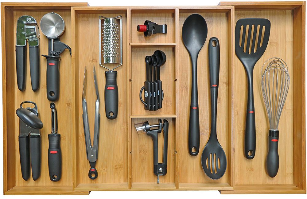 Aquí hay otro organizador de cajones ajustable , uno que tiene 9 compartimentos de varios tamaños diferentes que puede usar para mantener el desorden a raya y hacer que sea agradable y fácil encontrar todos los utensilios y otras cosas que usa en la cocina. Está hecho de bambú y tiene lados ajustables para que puedas colocarlo en una variedad de diferentes tipos de cajones de diferentes formas y tamaños.