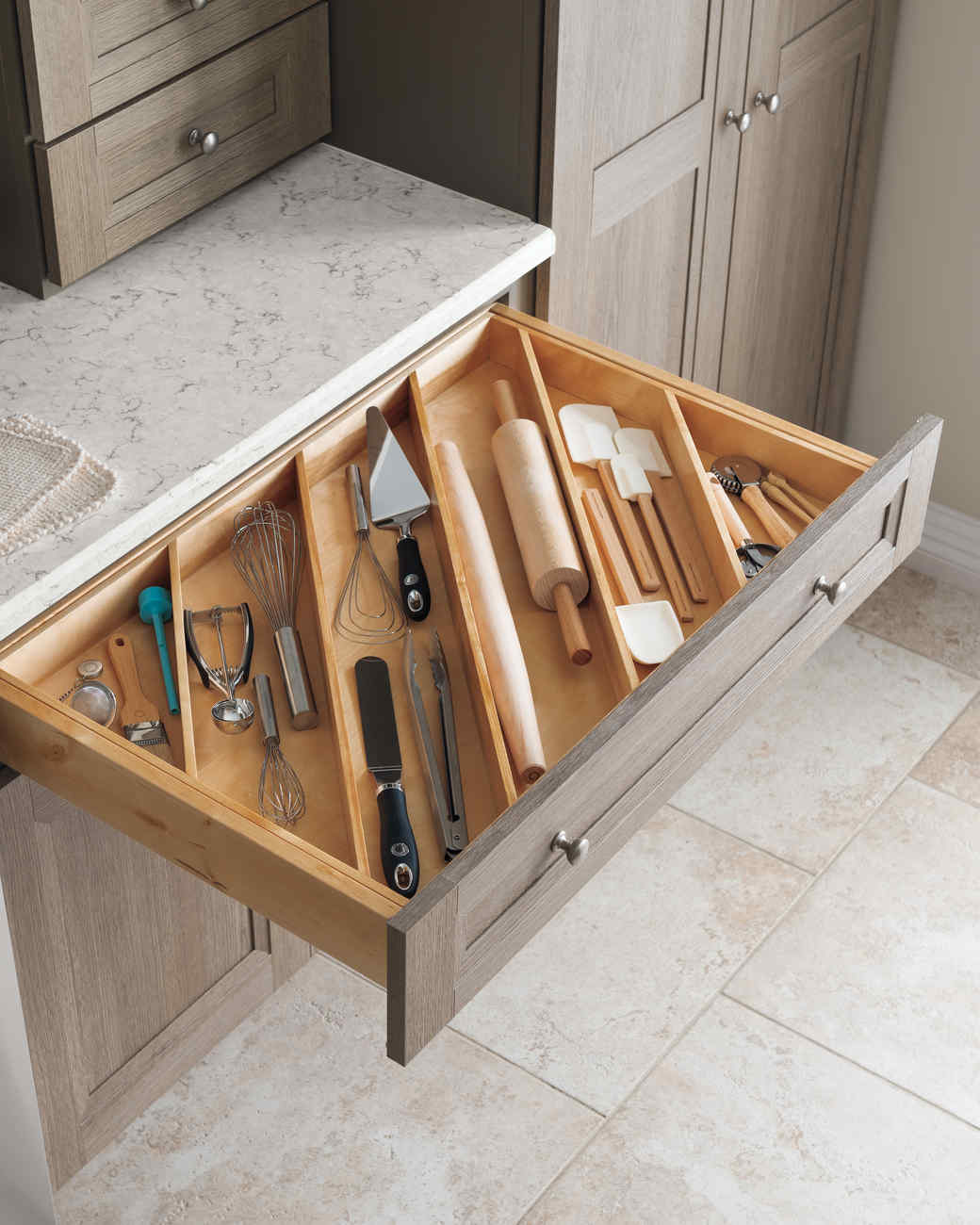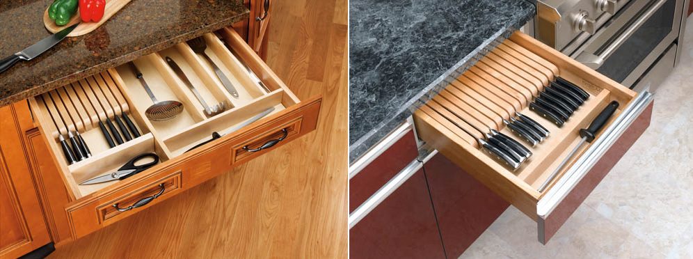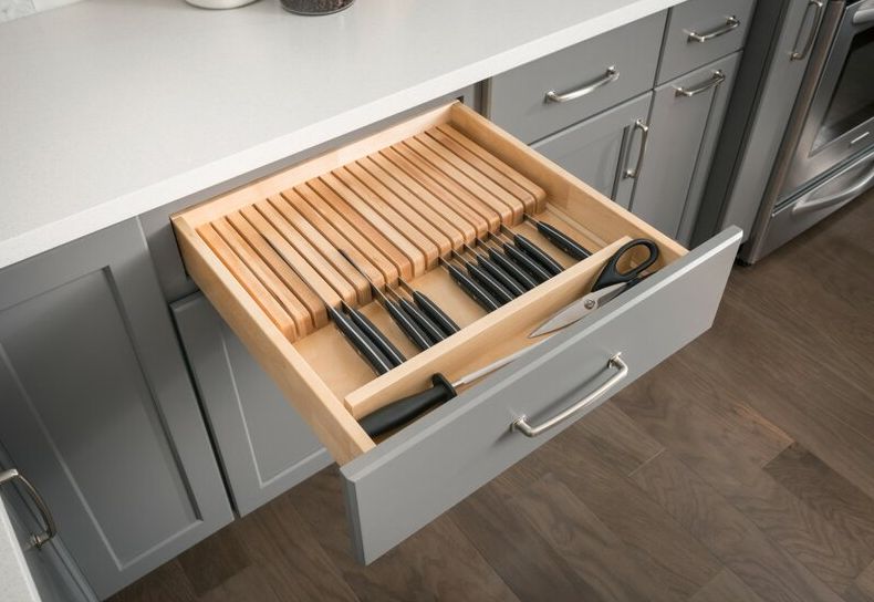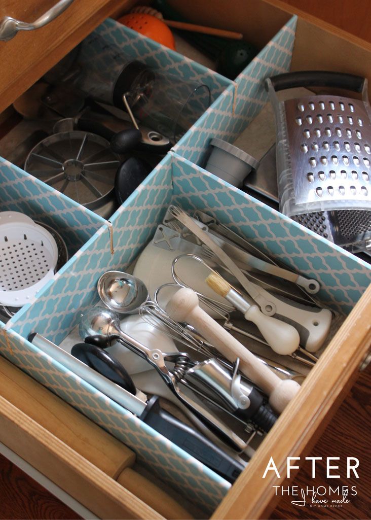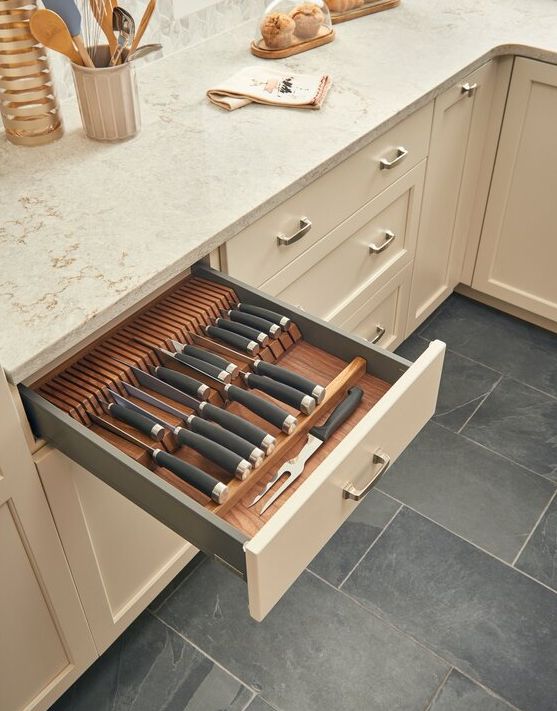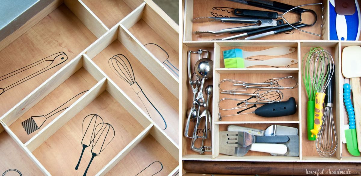 Los cajones de la cocina también contienen a menudo utensilios que tienen formas, dimensiones y propósitos diferentes. Una vez más, la mejor manera de asegurarse de que estén organizados de la manera que le gusta es construir un organizador de cajones de madera personalizado. Podría tener un aspecto similar al de Keystoinspiration siempre que esté utilizando los mismos utensilios en su cocina.
