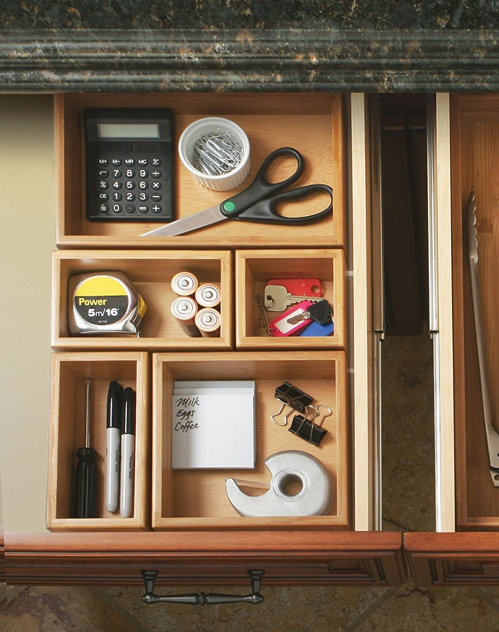 ¿No es molesto cuando algunos de los utensilios de cocina son demasiado largos para caber en el cajón? Un organizador de cajones normal sería inútil en este caso, pero por suerte hay otras opciones. ¿Qué tal un organizador de cajones con secciones diagonales? Le daría varios compartimentos de diferentes dimensiones, lo cual es genial si algunos de sus utensilios de cocina son extra largos mientras que otros son pequeños. Compruébalo en marthastewart .