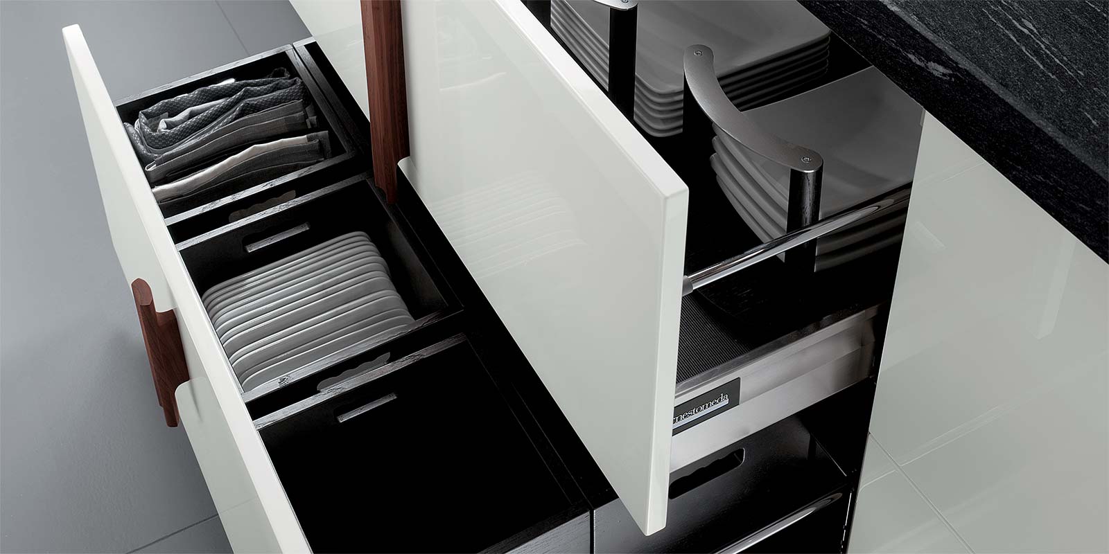 Hay muchos otros ejemplos elegantes de cocinas modernas de diseño que vienen equipadas con todo tipo de soluciones de almacenamiento ingeniosas y que ahorran espacio, incluidos organizadores de cajones o cajones dentro de cajones más grandes. Un ejemplo es la cocina Barrique que puedes ver en estas imágenes.