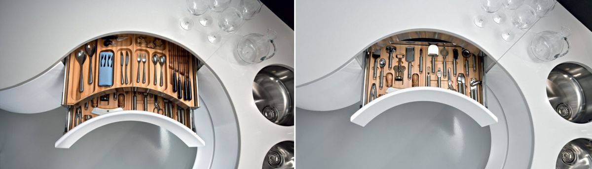 Ya es bastante difícil diseñar una cocina funcional con líneas rectas, así que imagina lo desafiante que se vuelve todo cuando se trata de curvas y formas inusuales. Bueno, ahí es donde realmente brillan algunos diseñadores. Las cocinas como la Artika impresionan con su combinación perfecta de apariencia y función y cuentan con detalles inesperados como este organizador de cajones en capas para todo tipo de utensilios.