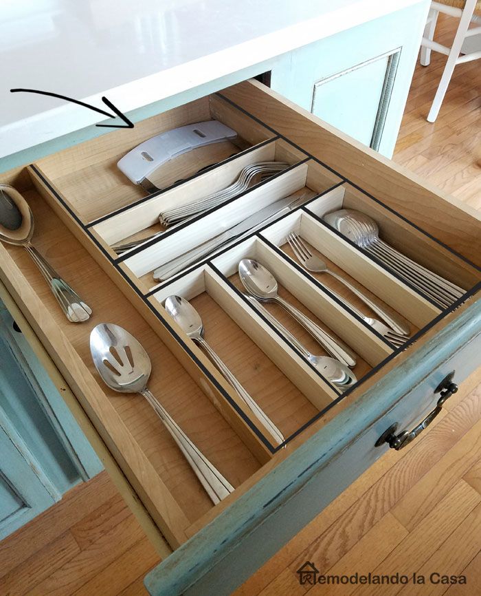 Ahora volvamos al tema y veamos algunas formas más en las que puede organizar el contenido de un cajón de la cocina. Dado que es bastante común que las personas guarden sus cubiertos en los cajones, hay muchos organizadores de cubiertos que puedes comprar. Estos se colocan dentro de los cajones. Sin embargo, no siempre encajan a la perfección y, en lugar de comprometerte, te sugerimos que construyas tu propio organizador. Es bastante fácil, especialmente si sigues un tutorial como el de la casa del patito feo .