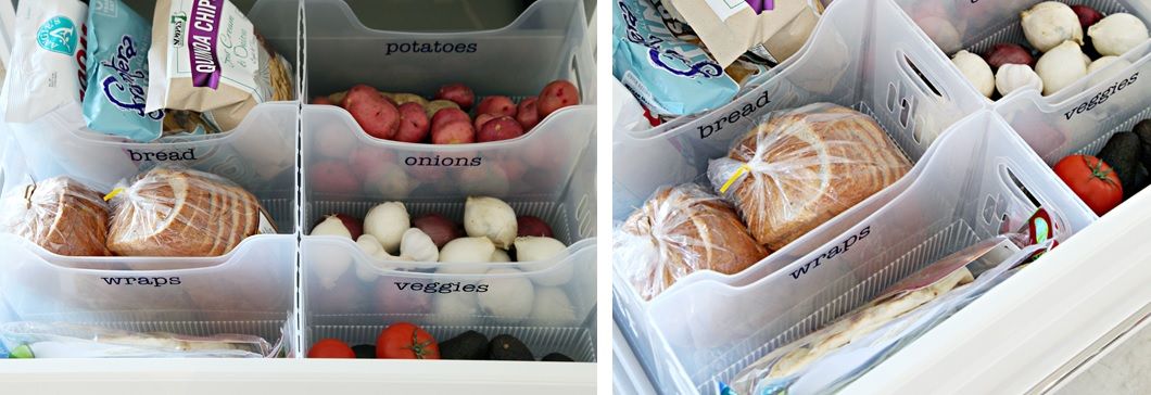Los contenedores también son excelentes para organizar el contenido de un cajón de la cocina, especialmente uno grande y profundo capaz de contener cosas como verduras, productos empacados y otros consumibles. Puede usar esta idea al organizar los cajones dentro de los gabinetes de su cocina, así como dentro de la despensa. Encuentre más ideas como esta en iheartorganizing .