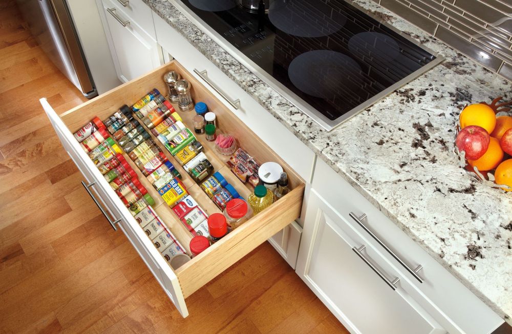 Antes de continuar con más consejos sobre cómo dividir y organizar el contenido de los cajones de la cocina, echa un vistazo a esta ingeniosa combinación de estante y cajón. En realidad, es una idea muy práctica y le alegrará saber que también es algo que puede armar fácilmente usted mismo. Considere reemplazar algunos de sus estantes fijos con cajas/cajones extraíbles para que pueda alcanzar los contenidos más fácilmente. También puede agregarlos entre estantes si hay suficiente espacio. Este cajón en particular sirve como estante de especias .