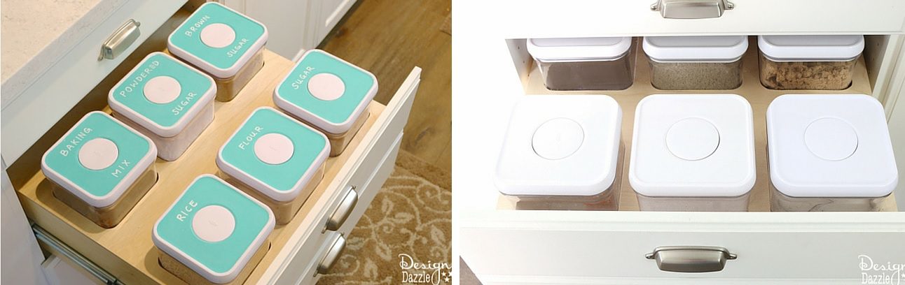 Los consumibles como el azúcar, la harina, el arroz y otras cosas también se pueden almacenar ordenadamente en los cajones. Una idea elegante es mantenerlos en recipientes a juego con etiquetas y tener un organizador de cajón especial que cree ranuras para cada recipiente. No es nada demasiado elegante, solo una pieza de madera contrachapada con recortes. Echa un vistazo a designdazzle para descubrir cómo armar esta idea.