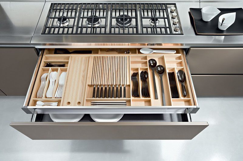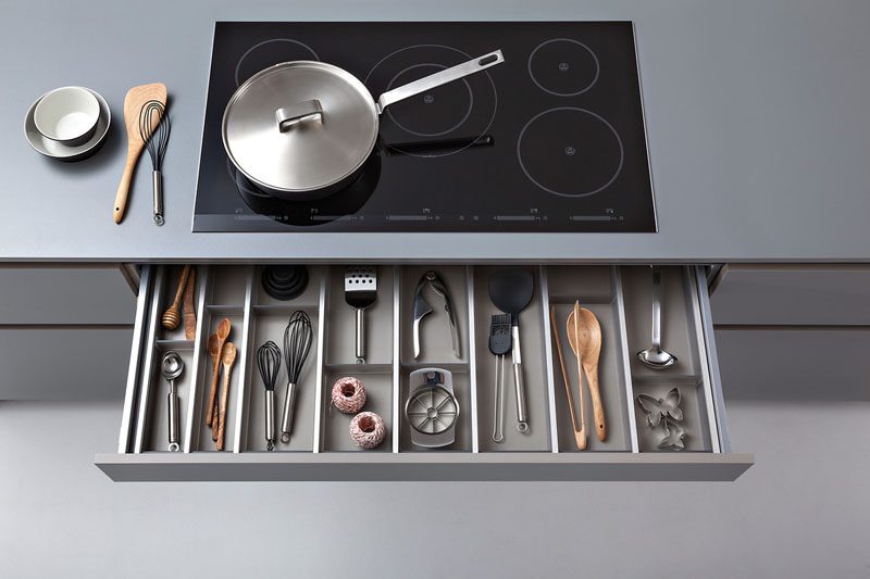 Algunas cocinas vienen con organizadores de cajones incorporados y han sido diseñadas de esta manera desde el principio. Echa un vistazo a este elegante diseño de cocina de leicht . Tiene un cajón especial para utensilios que es poco profundo y viene equipado con divisores.