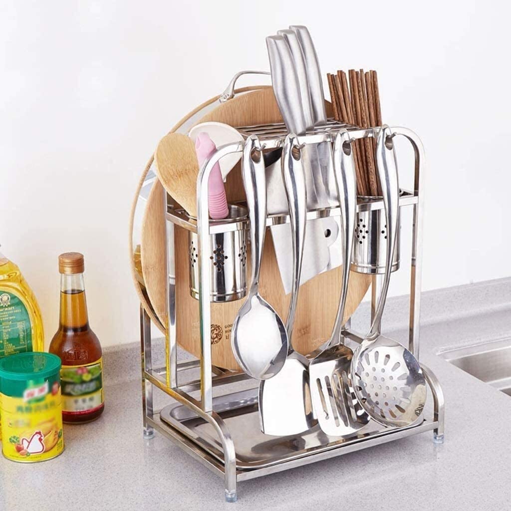Por supuesto, también hay organizadores que puede dejar a la vista y colocar en el mostrador si desea que las cosas estén al alcance de la mano en todo momento. Este está hecho de acero inoxidable y puede contener todo tipo de cosas. Puede usarlo para organizar sus utensilios de cocina más usados, tablas de cortar, tazones, cuchillos y más. Es una especie de estación todo en uno que puedes guardar en tu mostrador o esconder dentro de uno de los armarios o en un cajón cuando quieras ordenar el espacio.