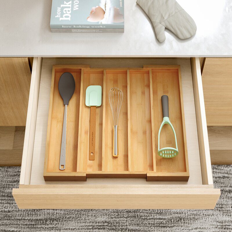 El organizador Halllie está hecho de bambú, lo que lo mantiene liviano pero también lo hace bastante duradero. Tiene cinco compartimentos donde puedes dividir tus cubiertos y varios utensilios y accesorios de cocina y también es ampliable. Puede colocarlo en cualquier cajón dado que es agradable y compacto y solo mide 2,63″ H x 18″ D con un ancho máximo de 22,25» cuando se expande.