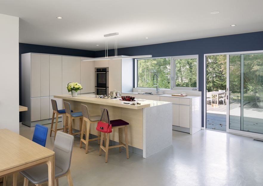 Esta isla tiene un diseño similar al que acabamos de describir. Los taburetes de bar utilizados en este caso destacan por su diseño geométrico. Son simples pero, al mismo tiempo, interesantes y elegantes. El asiento curvo de los taburetes Continuum destaca la elegancia de la estructura.