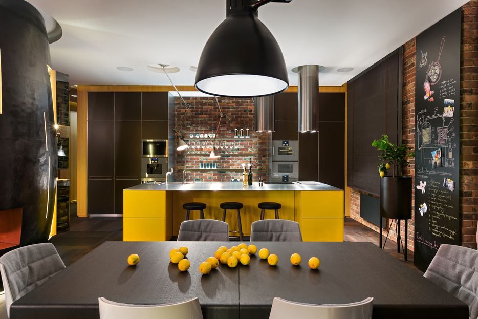 Los taburetes de bar utilizados en combinación con la isla de la cocina pueden considerarse como una oportunidad para agregar algo de color al espacio o para crear contrastes de estilo, forma o materiales. Tal estrategia puede ser refrescante y fácil de adaptar a muchos tipos diferentes de cocinas. {Encontrado en tg-studio }.