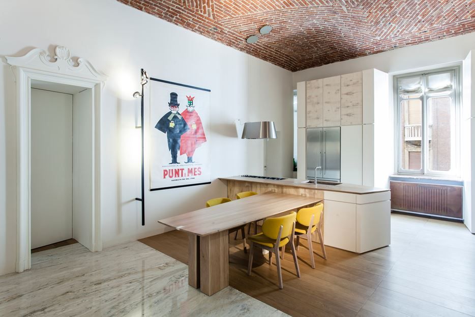 Hay otras formas de integrar la superficie de una mesa en el diseño de una isla de cocina. Una ubicación de perpendicularidad puede funcionar para ciertos tipos de diseños. En casos como este, la mesa puede ser más baja que el resto de la isla y puede ir acompañada de sillas de comedor. La silla Claire de Calligaris es una opción encantadora aquí. {Encontrada en deamicisarchitetti }.