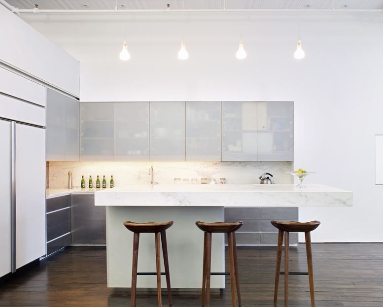 Aquí se presenta una combinación similar, aunque la paleta de colores es diferente. La decoración blanca se complementa con tonos más oscuros de marrón y negro con algunos toques de gris metálico y azul claro. Los taburetes de la barra y la isla se comunican de una manera realmente genial. {Encontrado en studiolabdesign }.
