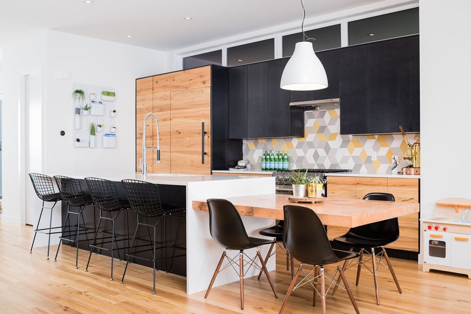 Esta extensión de isla de cocina permite que la mesa del comedor se convierta en parte del mismo espacio de una manera muy natural. Lo que también es hermoso y elegante es la forma en que los colores se complementan entre sí. Aunque los contrastes son fuertes, la decoración general sigue siendo cohesiva y bien equilibrada.