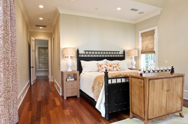 Si tiene un piso de madera marrón, elija lino blanco y marrón con el mismo esquema de color para sus cortinas. En las habitaciones con otros muebles de madera negra, como un armario, mantenga las paredes claras y aireadas, como el azul cielo.