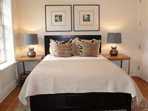 Las fotografías en blanco y negro colgadas sobre la cama funcionarán bien, especialmente si el marco es principalmente negro. Las imágenes abstractas hechas con pizarra sobre blanco roto también ayudarán a unir la habitación, visualmente hablando. Cuando tenga una cama negra con sábanas blancas o blanquecinas, opte por algunas imágenes que sean en su mayoría blancas con un borde o borde negro limpio para crear una apariencia coherente.
