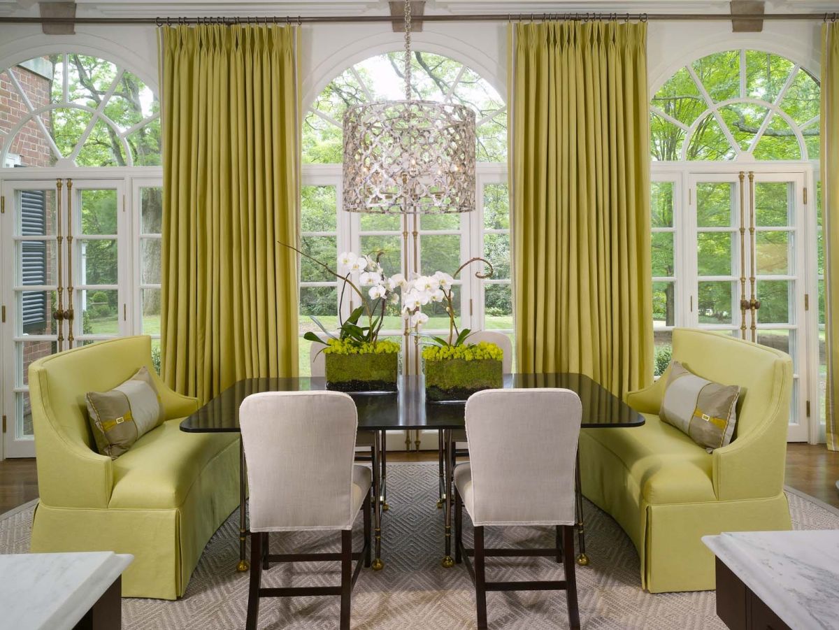 Si su familia es lo suficientemente hábil como para estar a gusto comiendo en la mesa del comedor en sillones de color chartreuse súper elegantes, entonces no puedo pensar en nada más etéreo. ¡Este comedor con infusión de cidra se ve sofisticado y delicioso a la vez! Las cortinas del techo al piso, colocadas simétricamente y para permitir la entrada de una cantidad máxima de luz natural hermosa y vegetación natural, se ven bien en un tono chartreuse ligeramente más oscuro que los muebles.