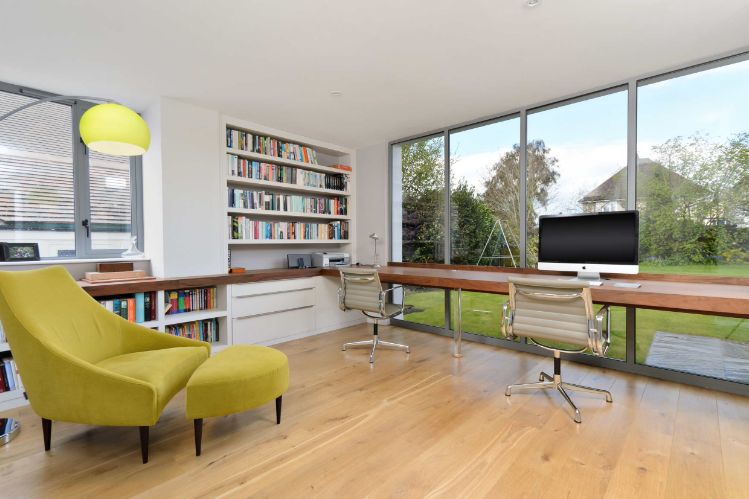 Cuando se trabaja con un color tan audaz, es importante mantener al mínimo otras distracciones visuales en un espacio. Por ejemplo, esta oficina hogareña contemporánea solo utiliza un toque de color chartreuse, con gran efecto, y minimiza todos los demás elementos de la competencia. Observe la pata del escritorio de acrílico y las ventanas desnudas.