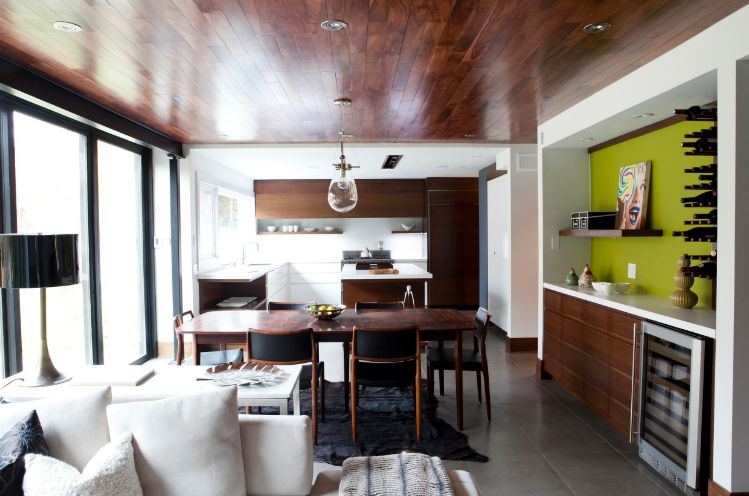 La madera de tono medio no es ni seria (como la madera oscura) ni laissez faire o tímida (como la madera rubia). Su versatilidad de estilo lo convierte en un telón de fondo perfecto para un color con personalidad de sobra. Los tonos de madera medios en realidad combinan bastante bien con la tonalidad y la saturación del chartreuse, creando un espacio cómodo y uniforme.