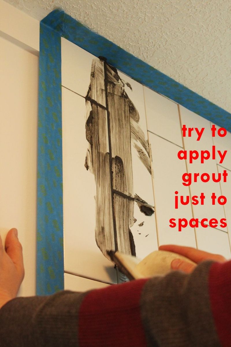 Aplique lechada en un área pequeña. Por lo general, funciona mejor cruzar solo la línea, no toda la loseta en las áreas que no aplicará lechada. Sin embargo, está bien si la lechada cae sobre el azulejo, podemos eliminarlo más tarde. Así que solo aplique lechada y alise.