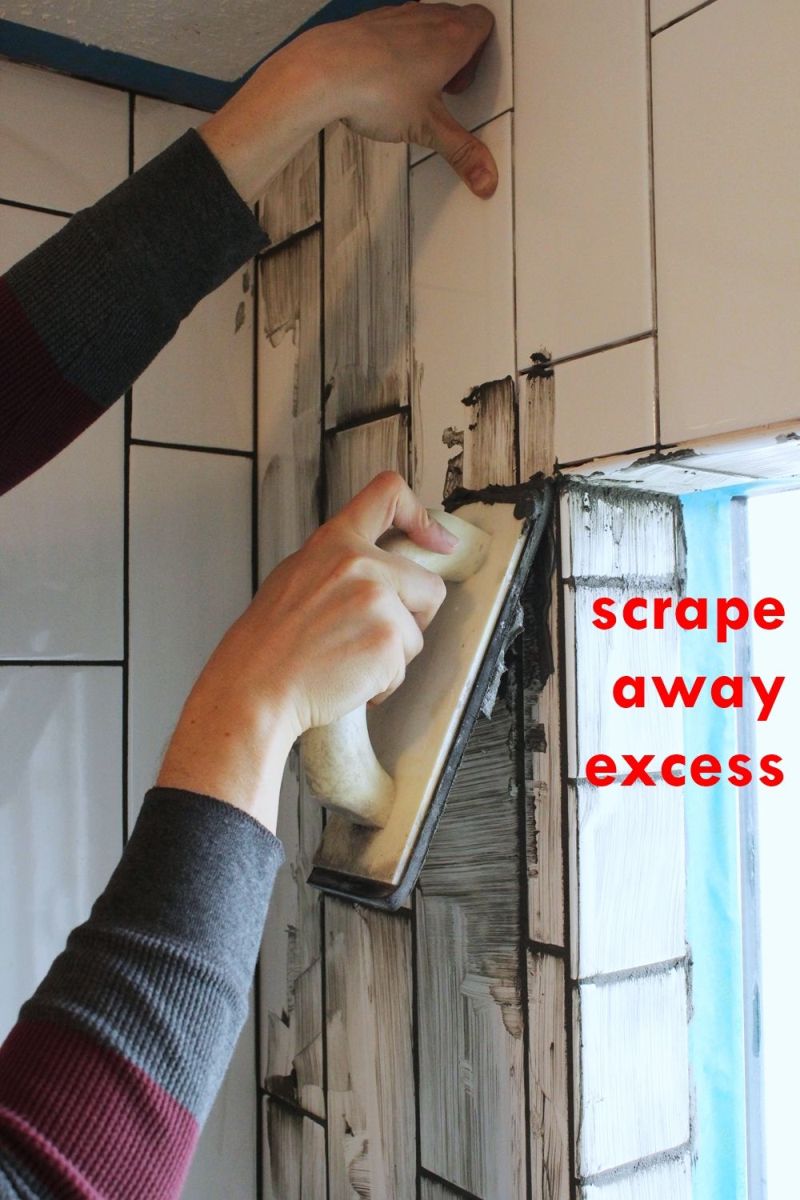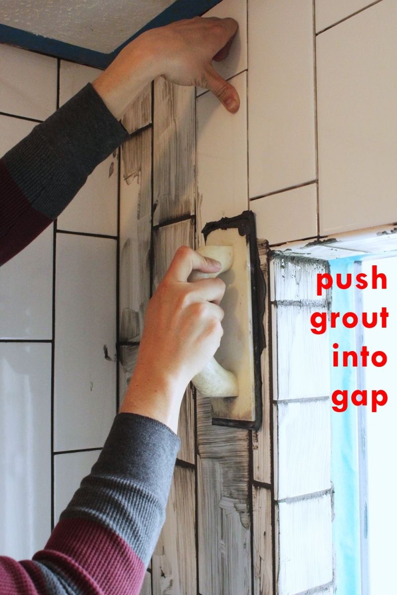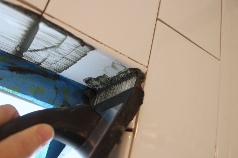 Cuando aplique lechada en las esquinas, coloque un poco de lechada en el borde de la llana. Empuje esa lechada hacia la esquina, dentro de la línea de lechada. Presiónelo hacia abajo y deslícelo hacia la línea de lechada. En resumen, tómalo en ráfagas pequeñas y cortas.