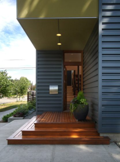 Este tipo de plataforma es similar a un porche delantero, pero la diferencia aquí es el techo. Una plataforma de entrada no está completamente cubierta por encima y tiene un diseño más abierto. Por lo general, tiene bancos y jardineras u otros accesorios y puede tomar una variedad de formas diferentes.