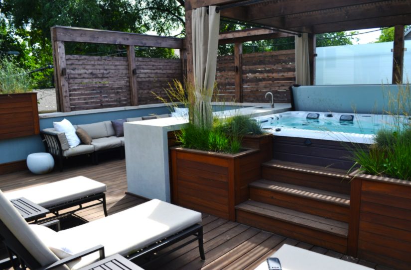 Es común tener una terraza alrededor de una piscina o un estanque. La plataforma a menudo está hecha de madera que no se calienta tanto con el sol como el concreto u otros materiales. Así, los bañistas pueden caminar cómodamente sobre él al entrar y salir de la piscina. Una terraza junto a la piscina también se complementa comúnmente con tumbonas y sombrillas. También puede tener una cocina al aire libre.